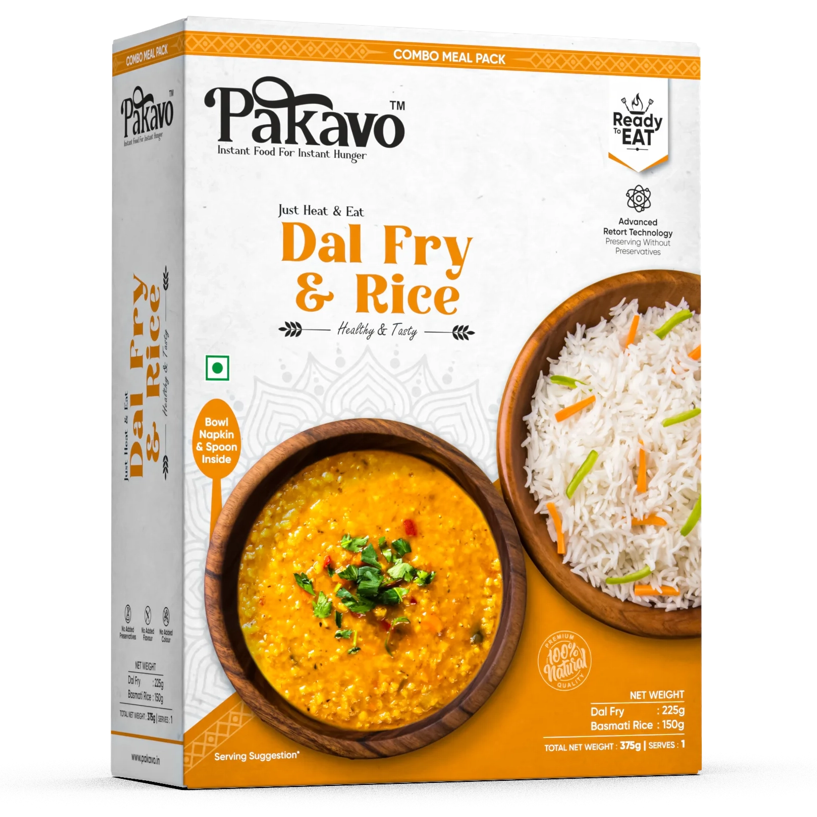Enjoy the authentic flavor of Pakavo Dal Fry & Rice Ready-to-Eat Combo Meal. Savor the deliciously spiced Dal Fry paired with fluffy basmati rice, conveniently packed with a microwaveable bowl, spoon, and napkin. Perfect for a quick and flavorful meal – just heat and eat! Store in a cool, dry place.
