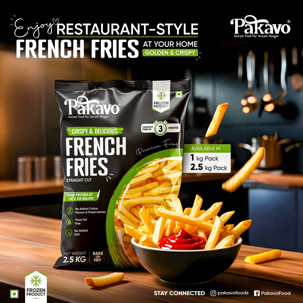 Enjoy the authentic flavor of Pakavo Crispy & Delicious French Fries. Made from premium golden potatoes, these fries turn perfectly crispy in just minutes. With no added preservatives, colors, or flavors, they are the ideal choice for a quick snack or party treat. Simply bake or fry and enjoy hot & crunchy every time!