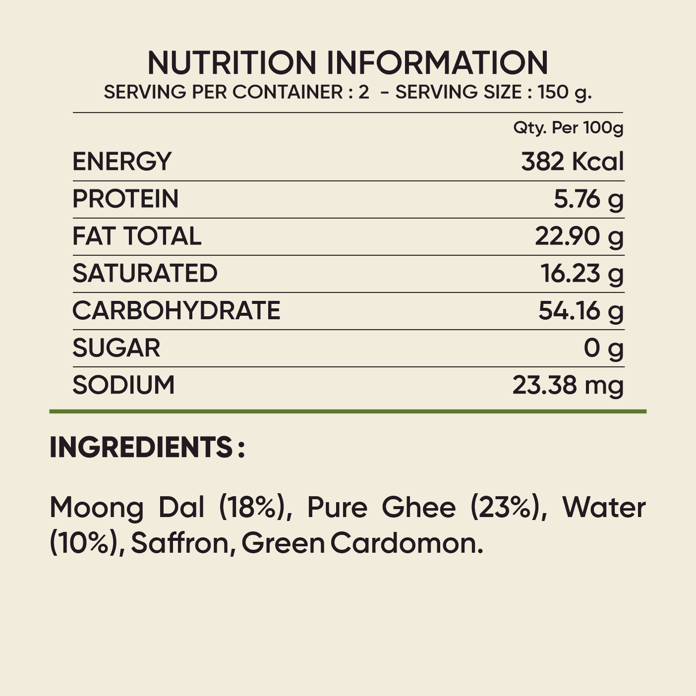 IngredientsMoong Dal (18%), Pure Ghee (23%), Water (10%), Saffron, Green Cardamom