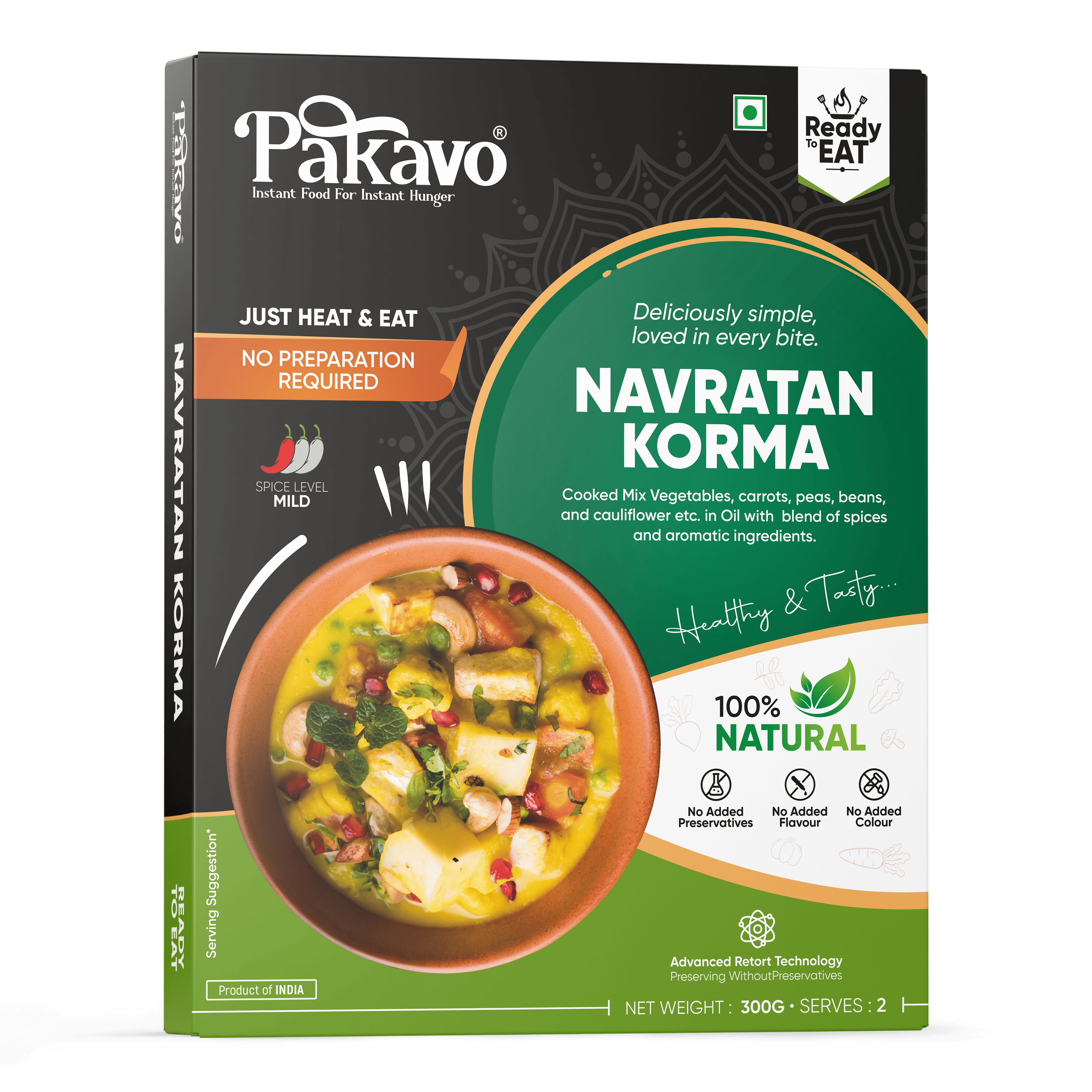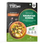 Enjoy the authentic flavor of Pakavo Navratan Korma. Indulge in a rich medley of vegetables, fruits, and nuts in a creamy, aromatic gravy, crafted without added preservatives or colors. Ready to heat and enjoy, this royal dish is perfect for any occasion. Store in a cool, dry place.