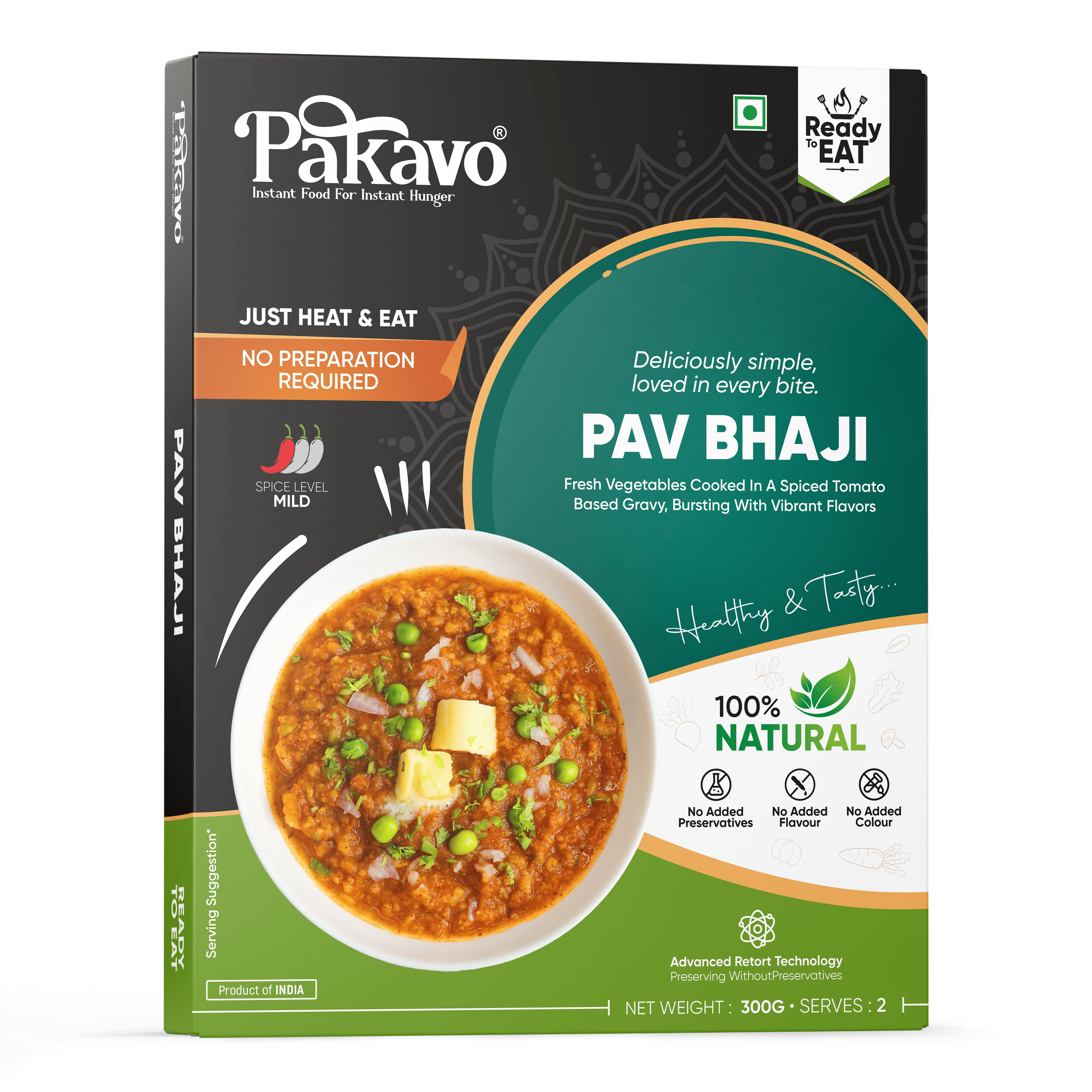 Enjoy the authentic flavor of Pakavo Pav Bhaji. Relish the taste of spiced vegetable mash in a buttery and tangy blend, crafted without added preservatives or colors. Ready to heat and enjoy, this classic Mumbai street food is perfect for any time! Store in a cool, dry place.