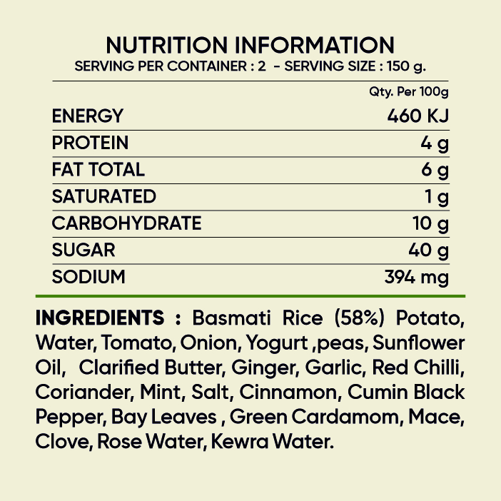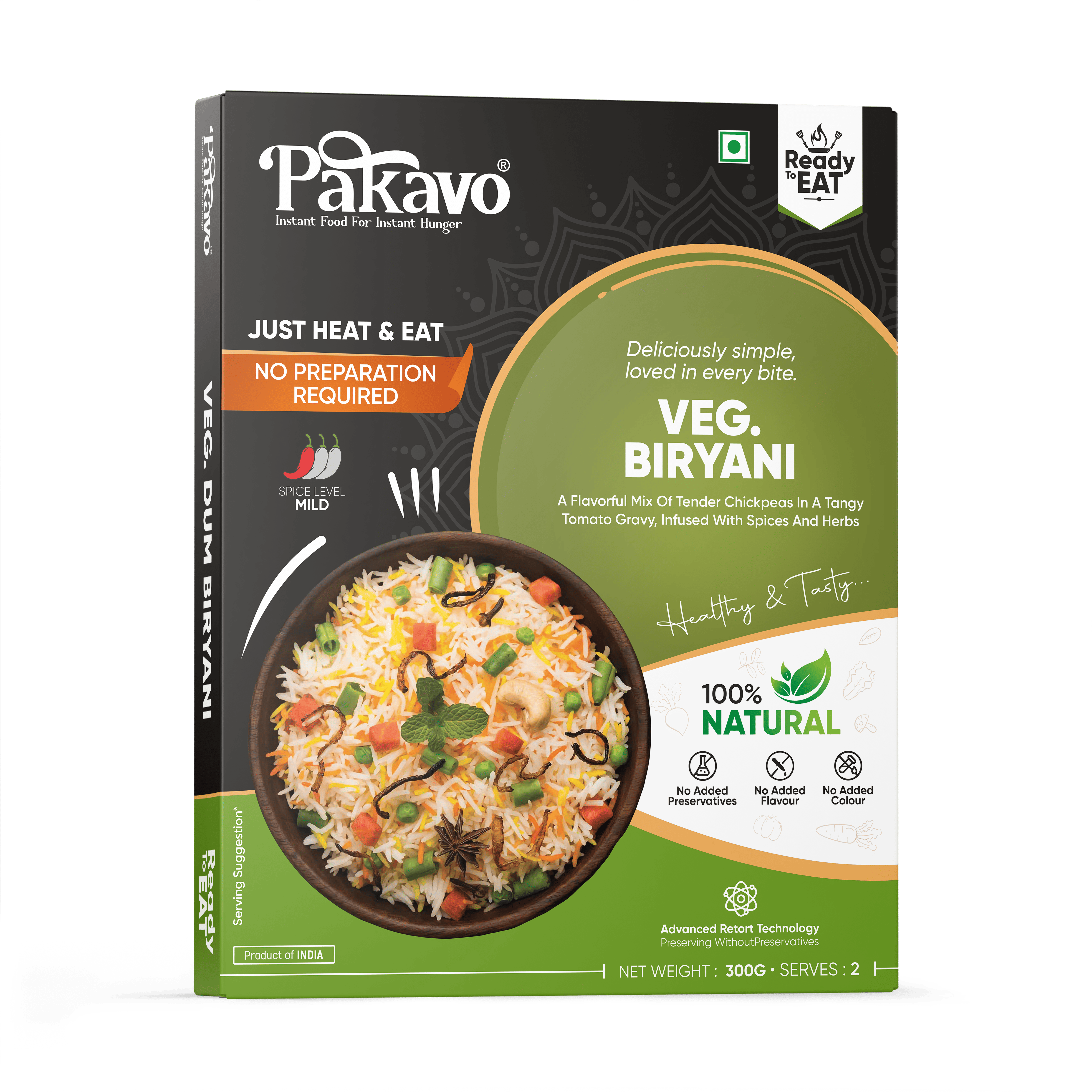 Enjoy the authentic flavor of Pakavo Veg Biryani. A fragrant blend of basmati rice, aromatic spices, and mixed vegetables, slow-cooked to perfection. Crafted without added preservatives or colors, this delicious dish is ready to heat and serve. Store in a cool, dry place.